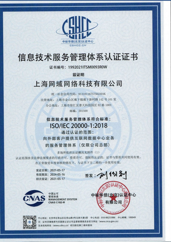 ISO20000信息技術服務管理體系認證證書