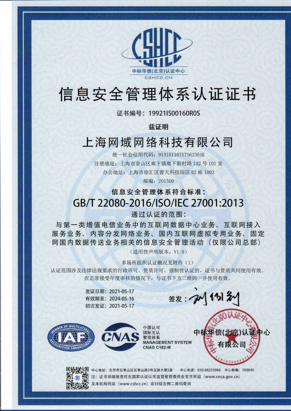 ISO27001 信息安全管理體系認證證書